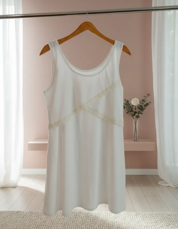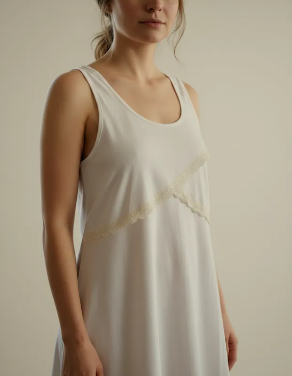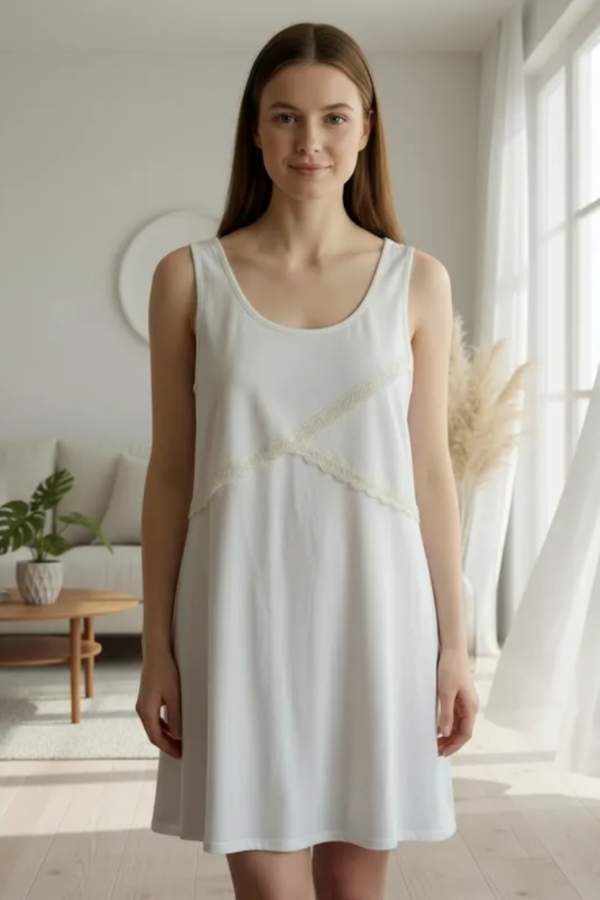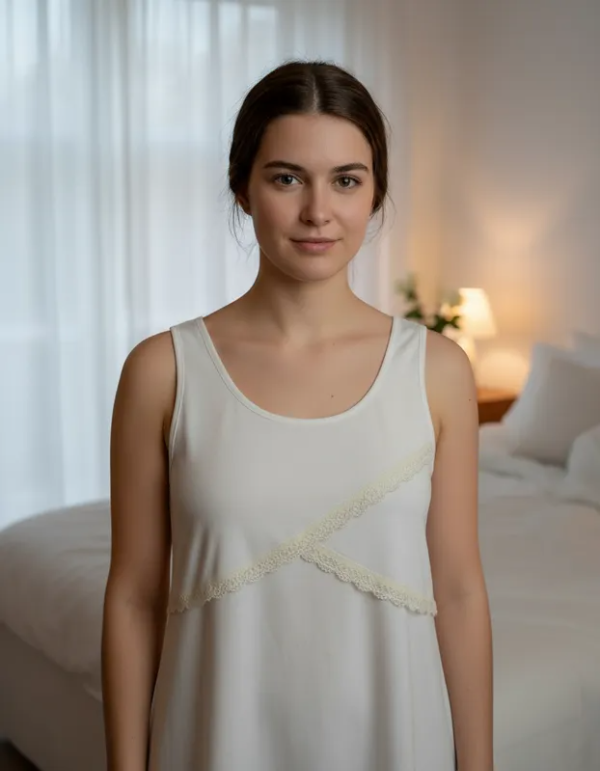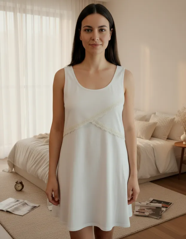 Camisón maternal Allegra confeccionado en algodón suave color crema, sin mangas, con delicado detalle de capas cruzadas en el frente con puntilla.