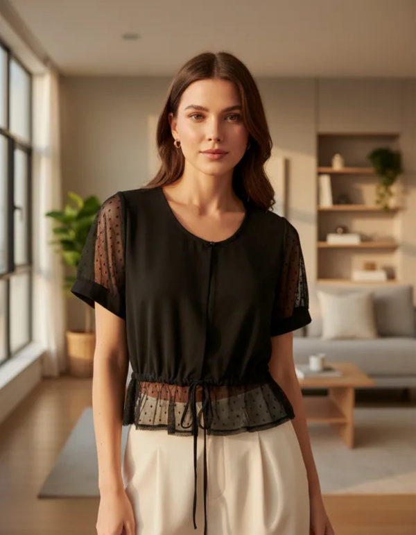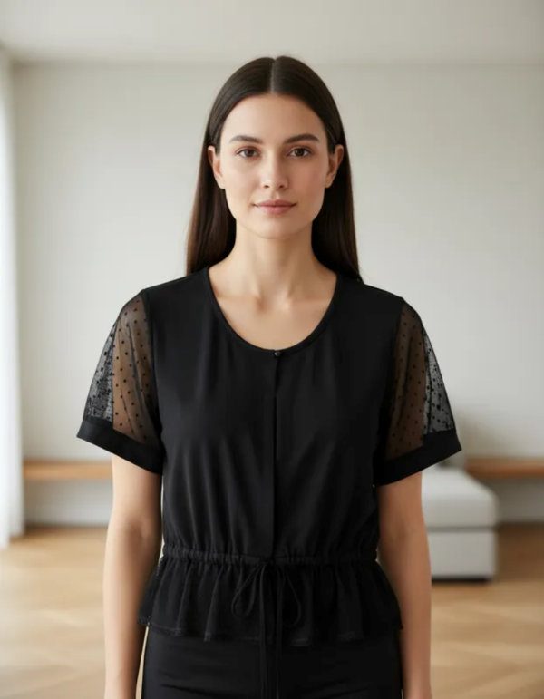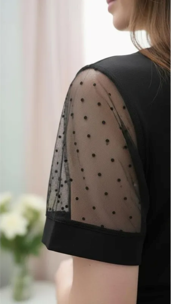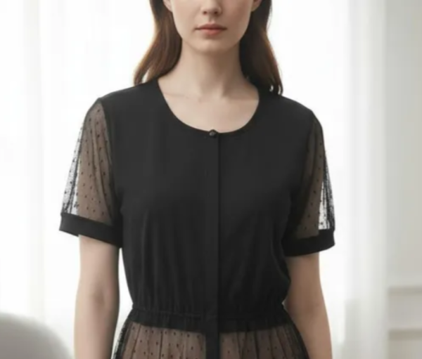 Está confeccionada con algodón peinado de alta calidad, sus mangas y el ruedo son de un suave plumetí que le aporta transparencia y femineidad.